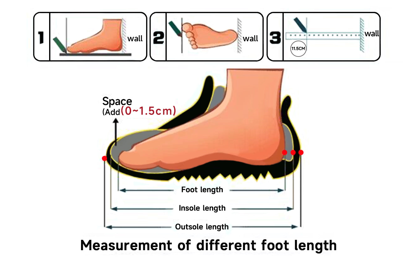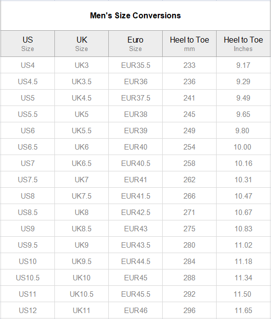 Please follow instructions below and use the measurements in Inches or Millimetres to confirm your perfect size. Chart below provides the internal space measurements of the shoe from heel to toe.