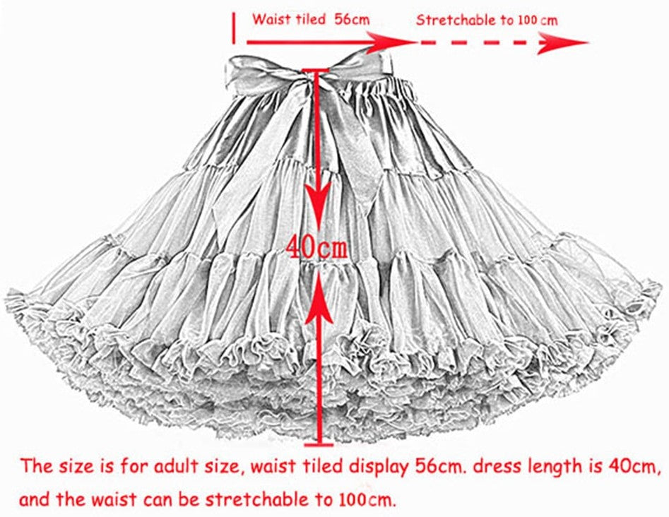 These petticoat's have an elastic waistband and designed to fit maximum waist size of 100cm: 56cm-100cm (22.05"-39.4" inches)